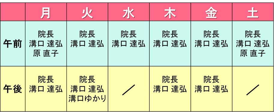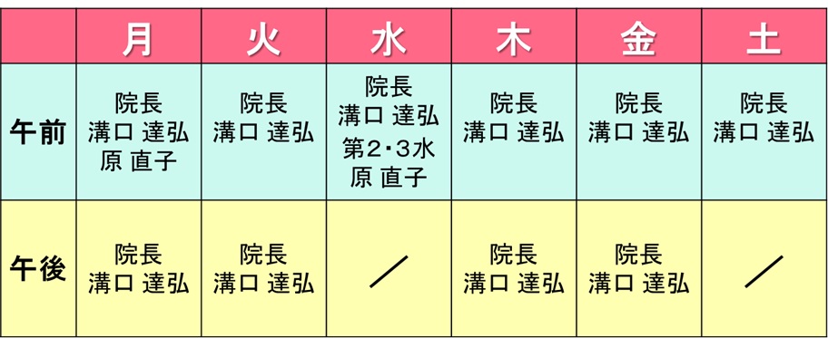 担当医師について(2026年3月16日更新) 担当医師は、以下の通りです。・溝口 達弘 医師・溝口 康弘 院長・原 直子 医師(月曜日、第2・第4水曜日) →(2026年4月~月曜日、土曜日)・溝口 ゆかり 医師(火曜日午後)(2026年4月~)※状況によって、担当する医師が変更となる場合があります。※特定の医師の診察を希望される場合は、お問い合わせ下さい。 (2026年3月末まで) (2026年4月以降)